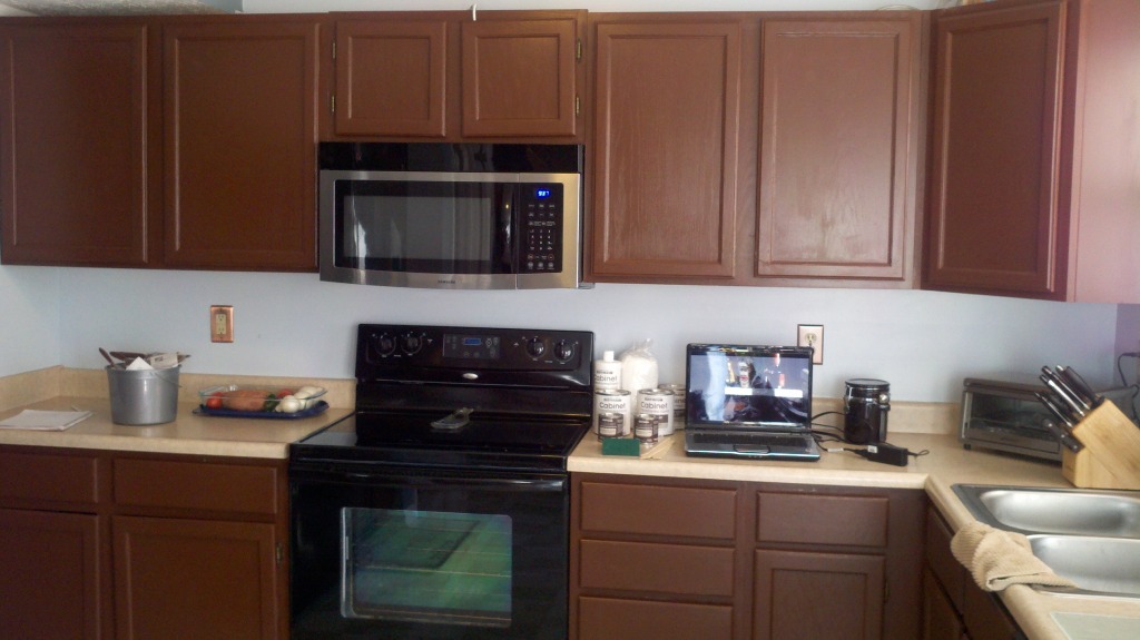 This picture was taken at the start of this year, just before I used a cabinet refinishing kit to do them right. I was afraid to go with a dark color, which is why we lived with these for a while.