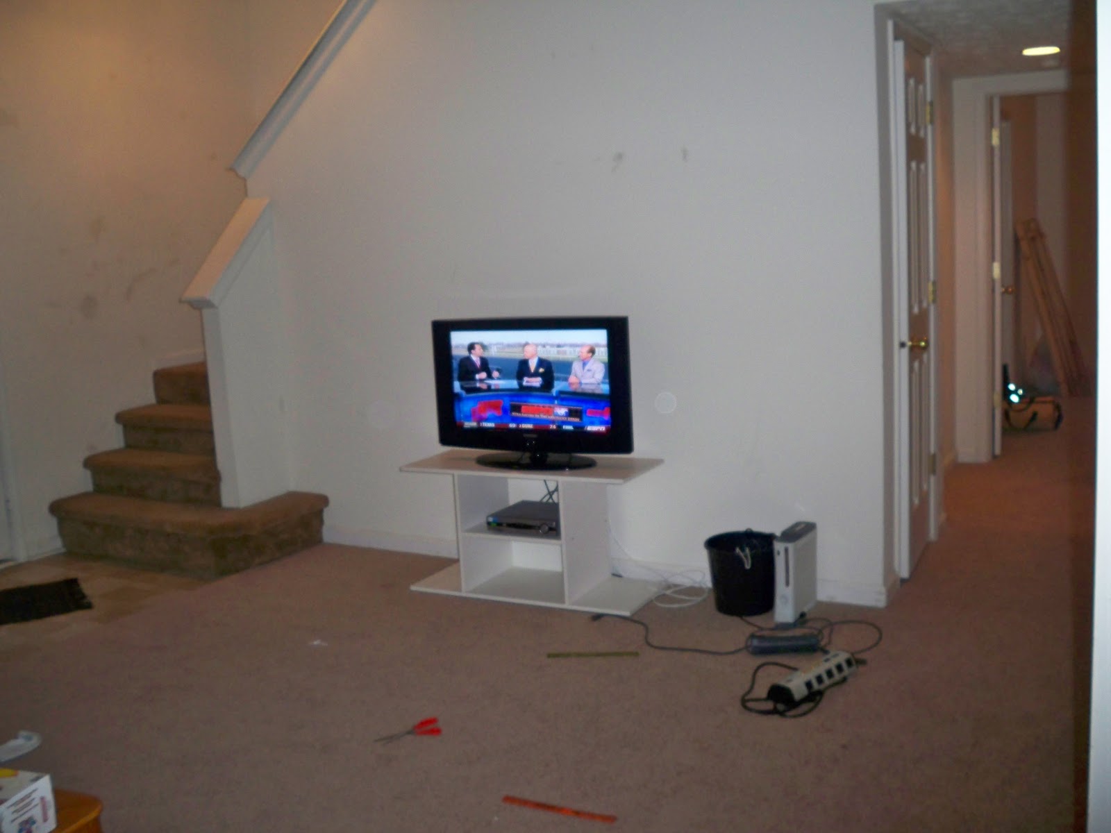 The TV cabinet came from my parents house, and fit the TV that had been sitting on the loft floor. I painted the half walls before this, but not the taller outside walls. The following picture is a bit random, but it does show when half the room was painted: