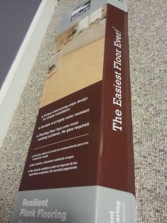 The box says “easiest floor ever” and I just might agree. Overlapping flaps stick to adjacent planks, making it a floating floor. It was a lot easier to put down than click-together flooring, especially around the door frame. My fingers often hurt after installing tongue-and-groove or click-together floors from trying to pull the seams tight. The planks could be repositioned after placement as long as I didn’t push down too hard. To cut the floors, you score the front with a utility knife & snap it. This works for curves too, making the cut around the toilet drain a cinch.
