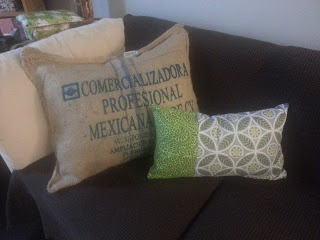 I made some pillow cases from fabric I had laying around. Aaron received a coffee gift basket that had a folded burlap sack as packaging, and I sewed that into pillows as well. The burlap was a bit unwieldy to sew. I just stuffed in a pillow that no longer matched our decor. The pillow on the left is identical to the one I stuffed into the burlap on the right. They tuned out better than I expected!