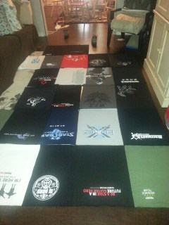 I’m also making a T-shirt blanket for myself from all my GameStop T-shirts. I want to make one big enough to cover the Lovesac, but I don’t think I have the space to properly construct something of that proportion. I took pictures of every shirt today so I could assemble the design on my computer. I’d prefer to lay it out by hand but I don’t have a flat surface that big. Well, not without moving a lot of furniture. I laid a few out on the floor today just to see what they would look like as a blanket.