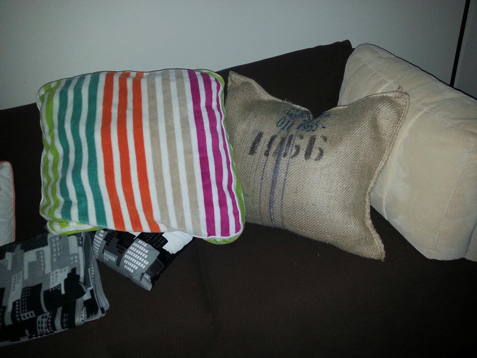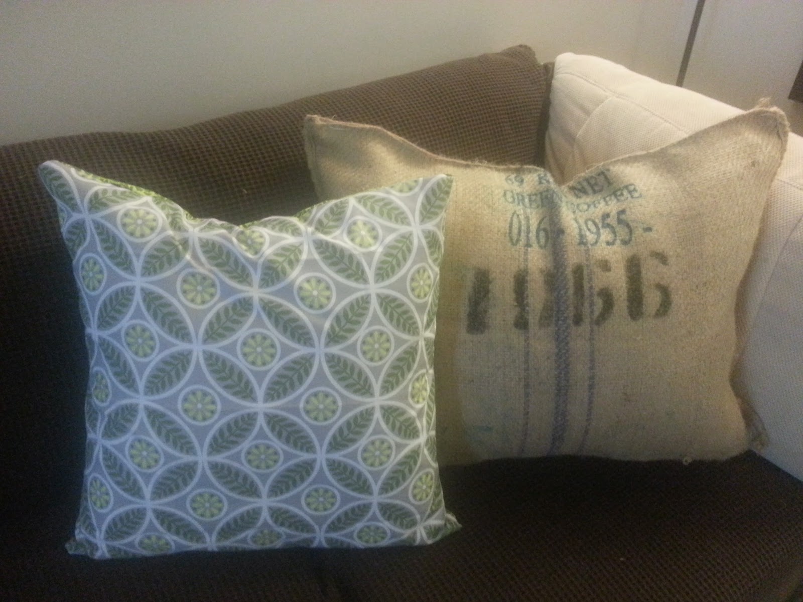 I made some pillow cases from fabric I had laying around. Aaron received a coffee gift basket that had a folded burlap sack as packaging, and I sewed that into pillows as well. The burlap was a bit unwieldy to sew. I just stuffed in a pillow that no longer matched our decor. The pillow on the left is identical to the one I stuffed into the burlap on the right. They tuned out better than I expected!