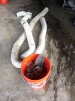 Our dryer stopped working late last year. It took us about a week to fix it, because every time we thought we fixed it, we found out later that we were wrong. We thought the lint traps were clogged, so we vacuumed them out. Then, we pulled out the dryer and cleaned it out from the back, and pulled out a clog in the wall. Next, we went outside (after quite a snowstorm) to see if the vents were open. They were iced shut. We de-iced them by banging them with a broom handle. We went into the attic space above the garage and saw the vent hose sagging in between the joists. The next day, we prepared ourselves to drain them, only to discover that it was solid ice. We tried to shake the ice down, but the flimsy hose fell apart. The day after that, we went to get a new dryer hose and installed it, finally restoring order to our dryer. We also added 2x4s to keep it from sagging again.