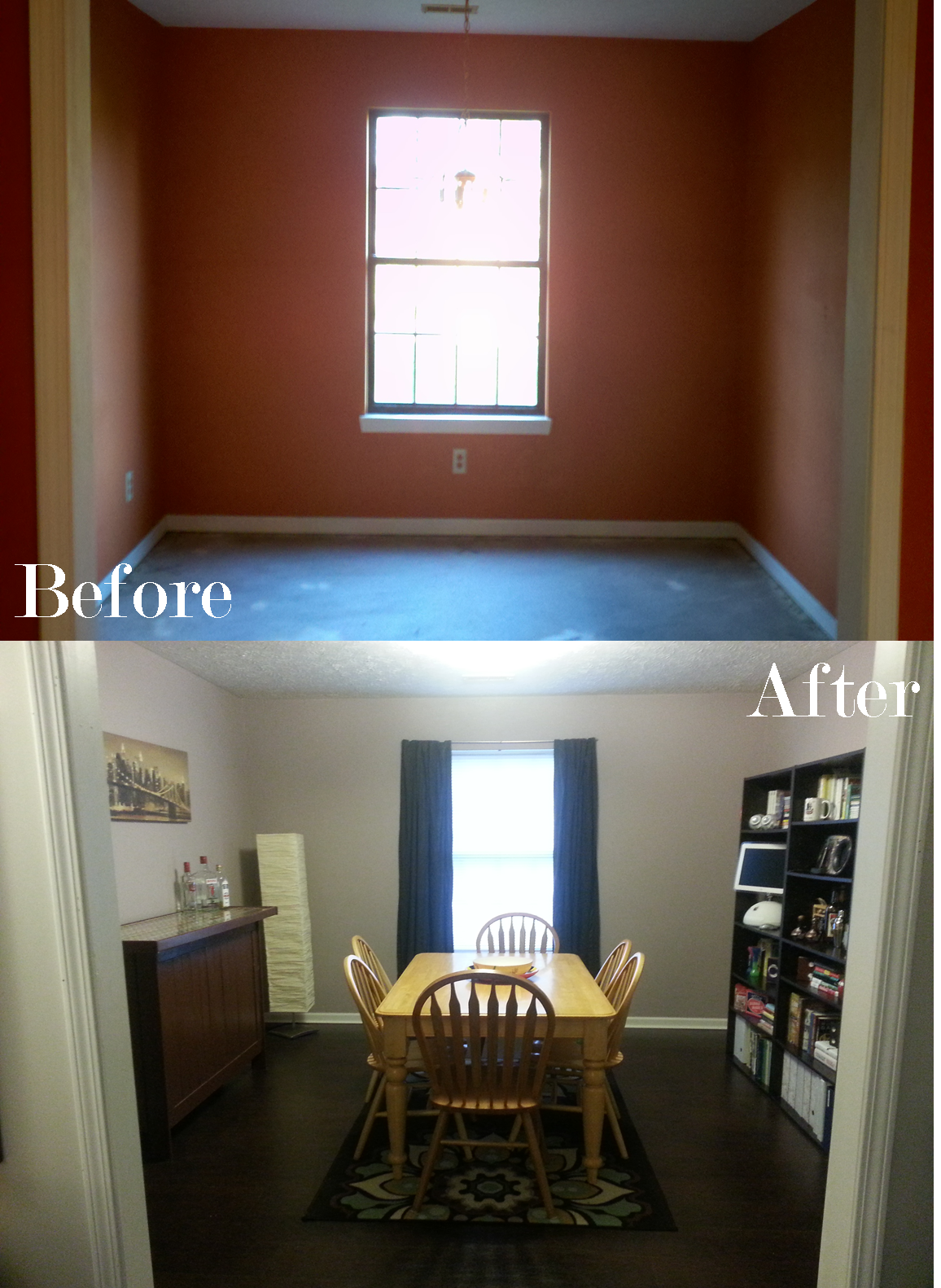 The office was the last room to be finished. This room served as temporary storage (aka dumping ground) for everything that was still packed or unused. We got rid of a lot of stuff while living here, as this home was smaller with no storage room. After a few trips to Goodwill, this room was ready to go. (The closet is a different story.) As a side note, I started pulling up the carpet before I remembered to take pictures.