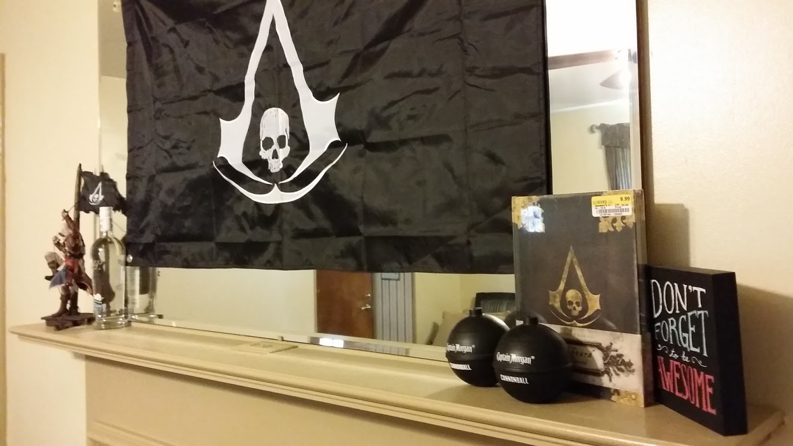 A few months back, we hosted a party for Aaron’s cousins. Having a theme was by no means necessary, but we chose Pirates all the same. The flag and statue are from Assassin’s Creed IV, and I just happened to see a gift set of Captain Morgan that came with cannonball cups. We made a pirate Spotify list (turns out there are a lot of pirate songs out there) found a bunch of rum drink recipes, and decorated the mantle. That was in march… and I’ve since added a pirate book and a bottle of rum to the mantle. I’m not sure what it says about who I am as a person that this still delights me greatly. Even better, Aaron has said nothing about taking it down, which is either a sign of his love or his indifference. I recently realized that whenever delivery people come to our door, their first glimpse in into the house reveals a gigantic black pirate flag…